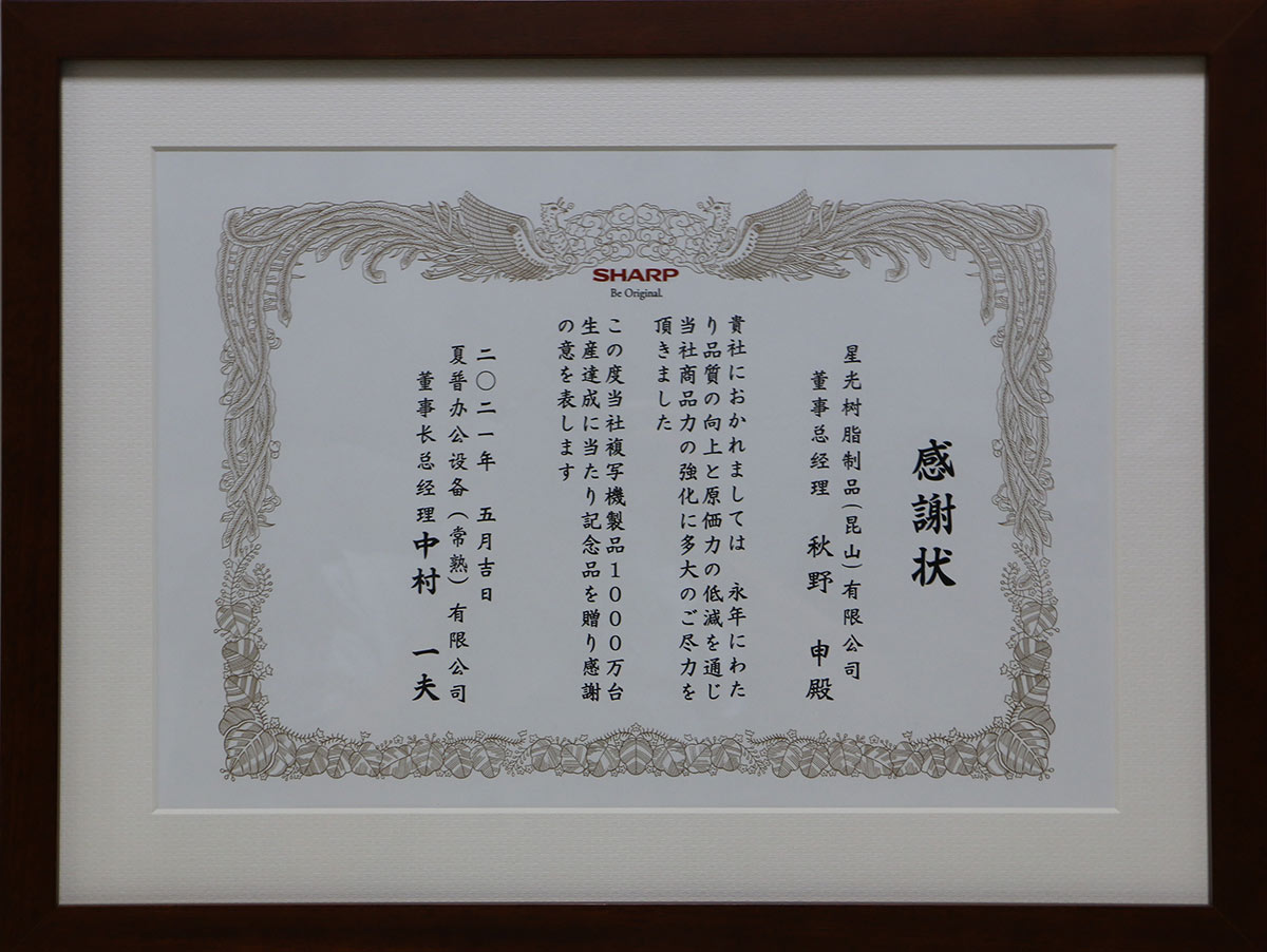 新宝gg登录官网荣幸参与并见证了夏普办公设备(常熟)有限公司这一历史成就。2021年6月23日夏普办公设备(常熟)有限公司中村一夫董事长亲临星光树脂就此历史成就感谢我司的紧密配合并颁布感谢奖,总经理代表公司从中村董事长手中接过金灿灿的奖杯。