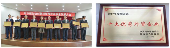 Yokoyama, General Manager of Starlite was invited to attend the meeting. Fifty advanced enterprises were commended at the meeting, and they were respectively awarded the titles of “Top 10 Enterprise Taxpayers”, “Top 10 Outstanding Foreign-funded Enterprises”, ”Top 10 Outstanding Domestic Enterprises”, “Top 10 Innovative Enterprises”, and “Top 10 Technical Upgrade Enterprises”. Among them, Starlight Plastic Products (Kunshan) Co., Ltd. was awarded the title of “Top 10 Outstanding Foreign-funded Enterprises” in Zhoushi town, and GM Yokoyama came to the stage and received the award.
